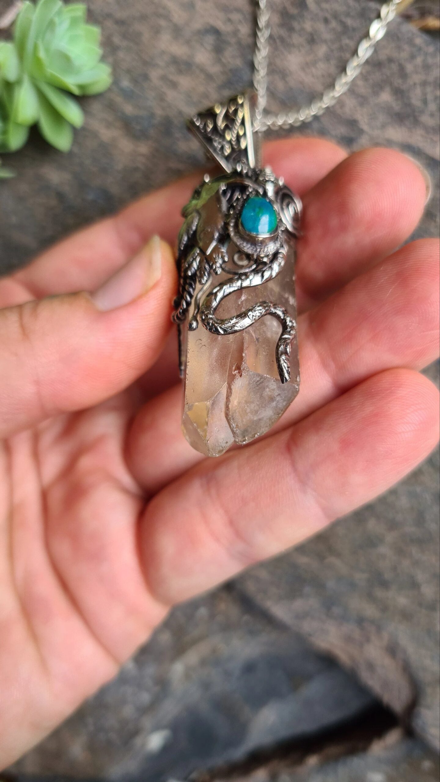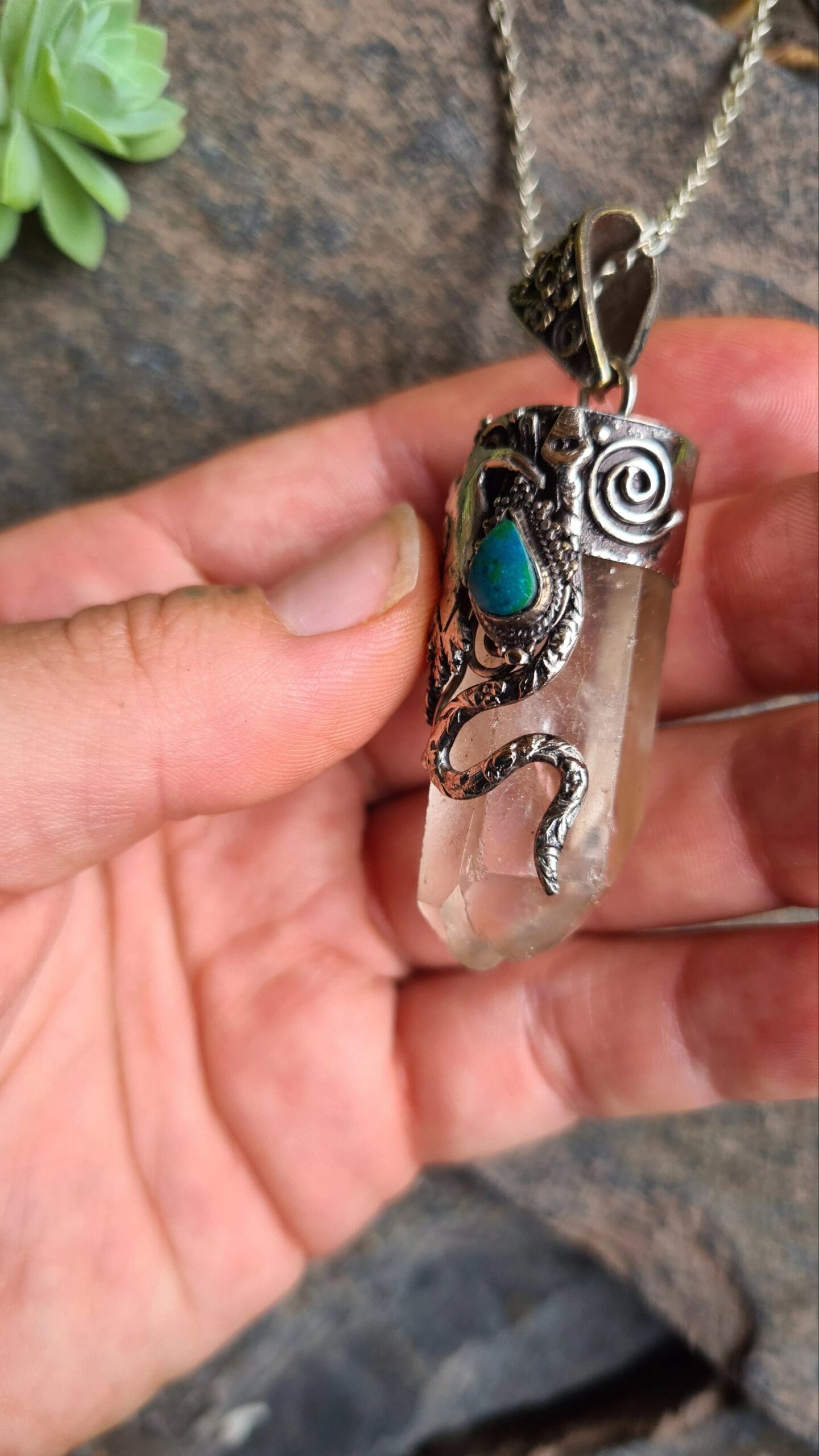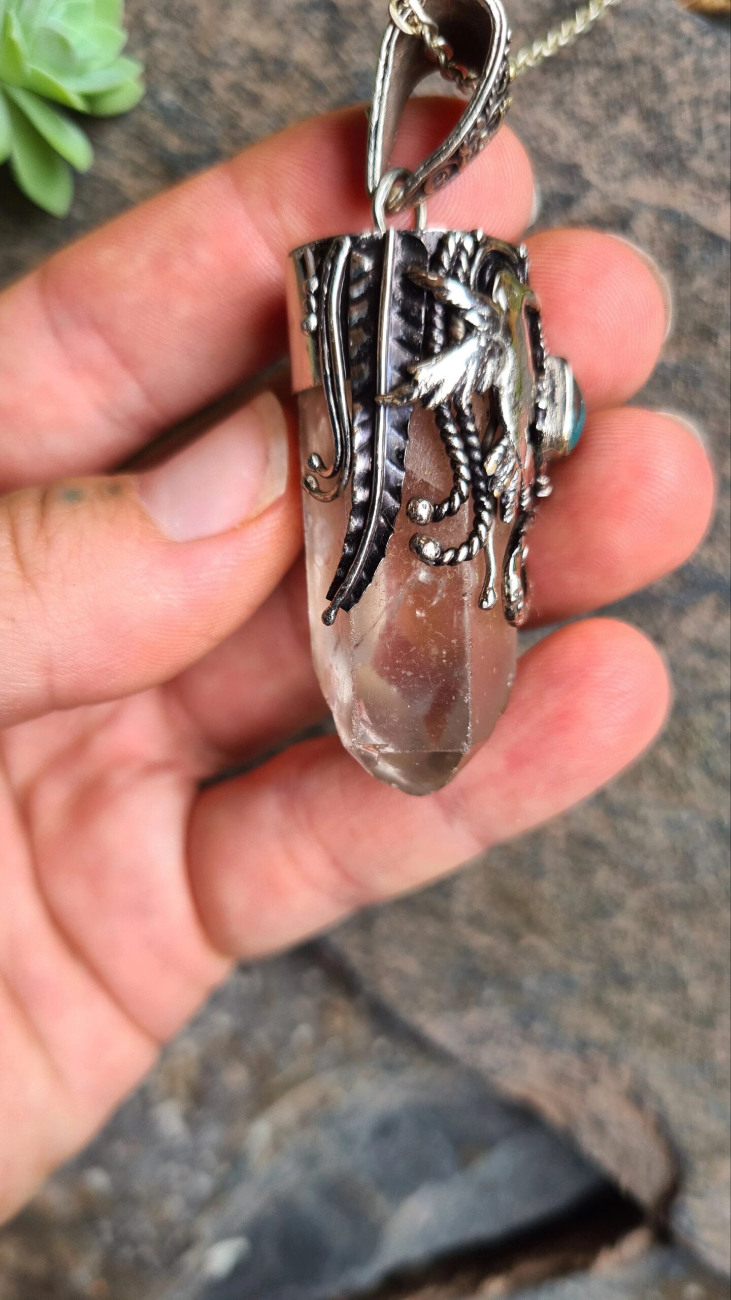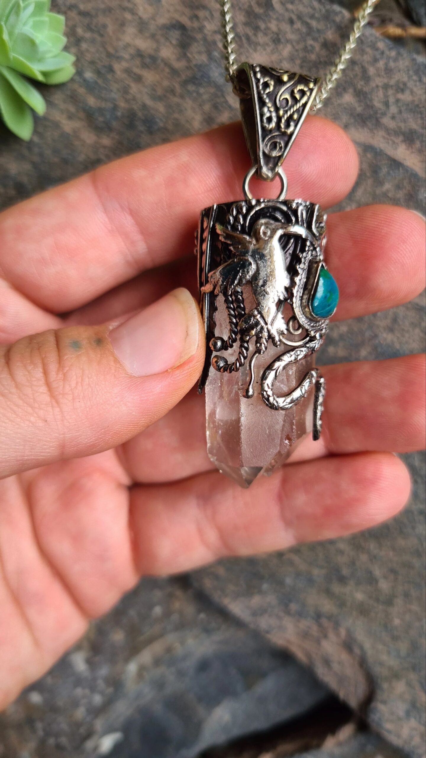 Gracing the crystal is a detailed Alpaca silver design featuring the Kolibri (Hummingbird)—the messenger of joy—and the Serpent, representing transformation and the wisdom of the earth. A brilliant teardrop of Chrysocolla is inset at the center, bringing the vibrant turquoise colors of the Andean landscape to this high-vibration piece.