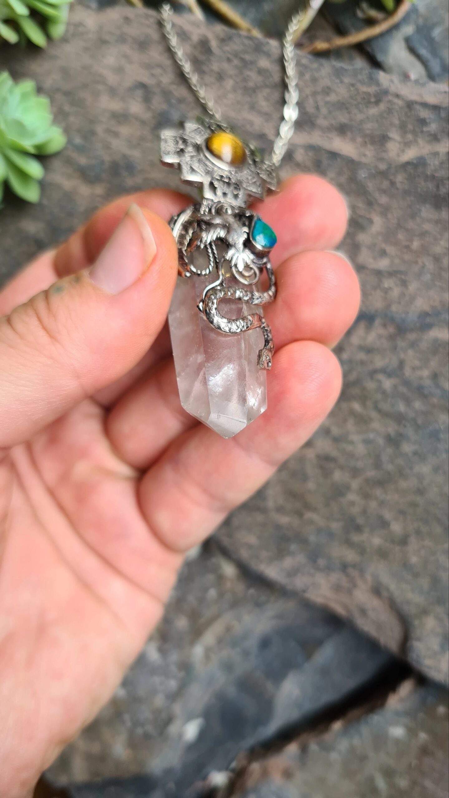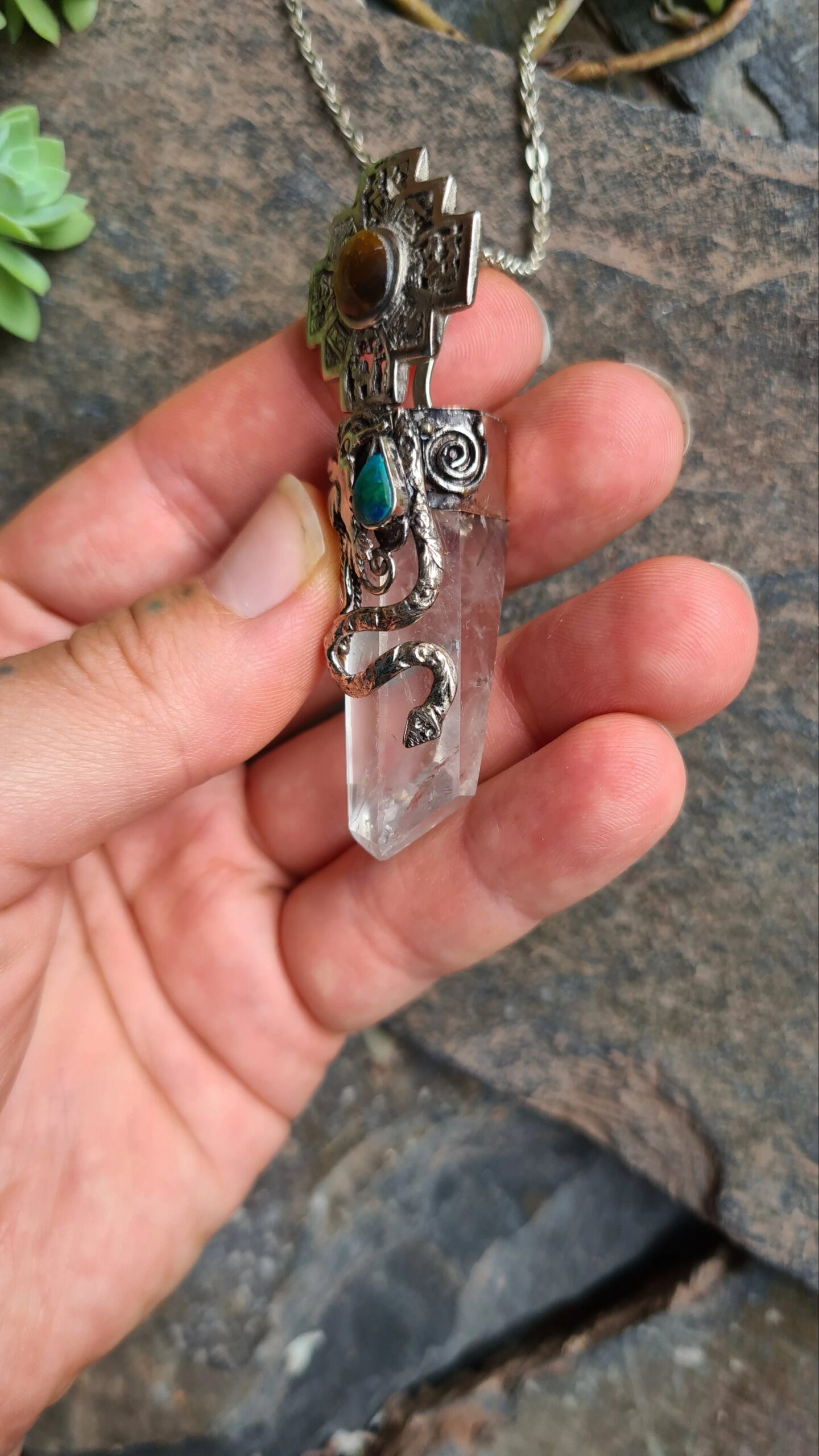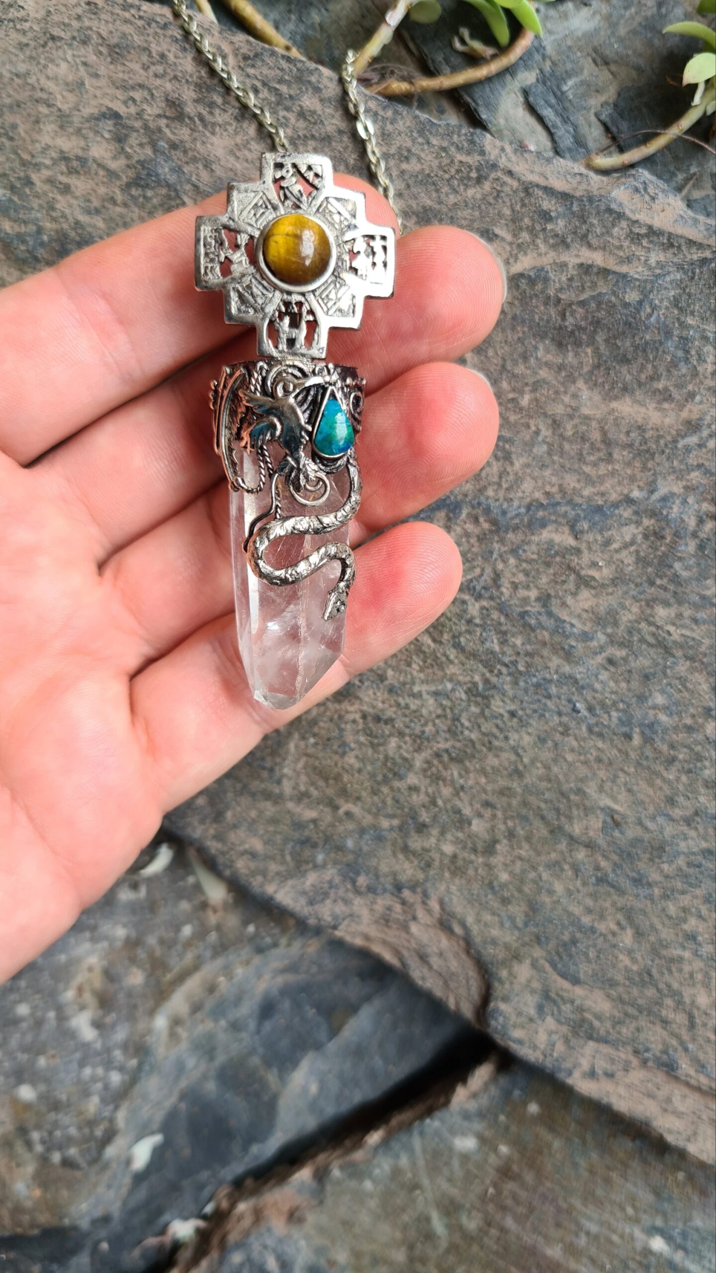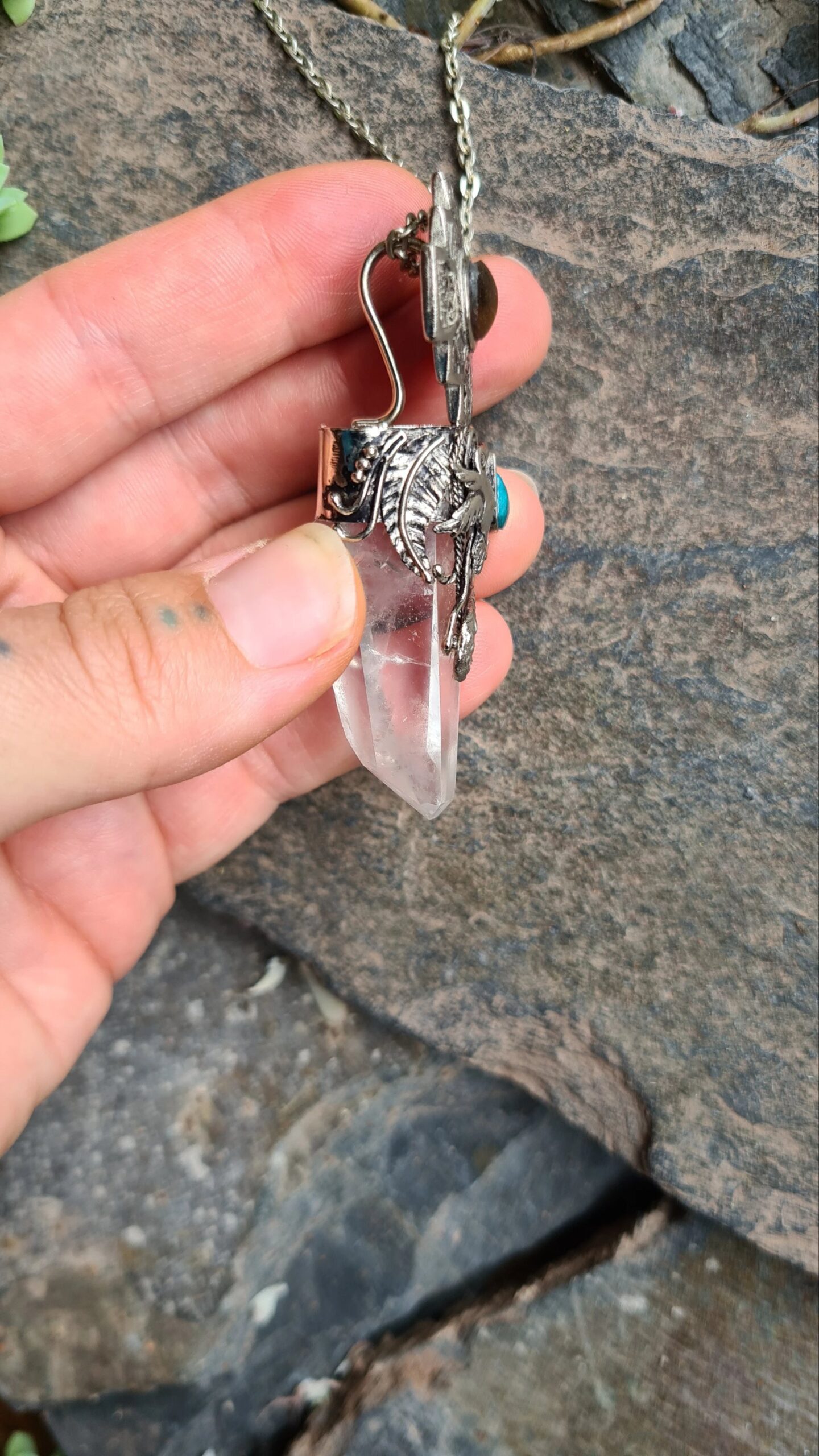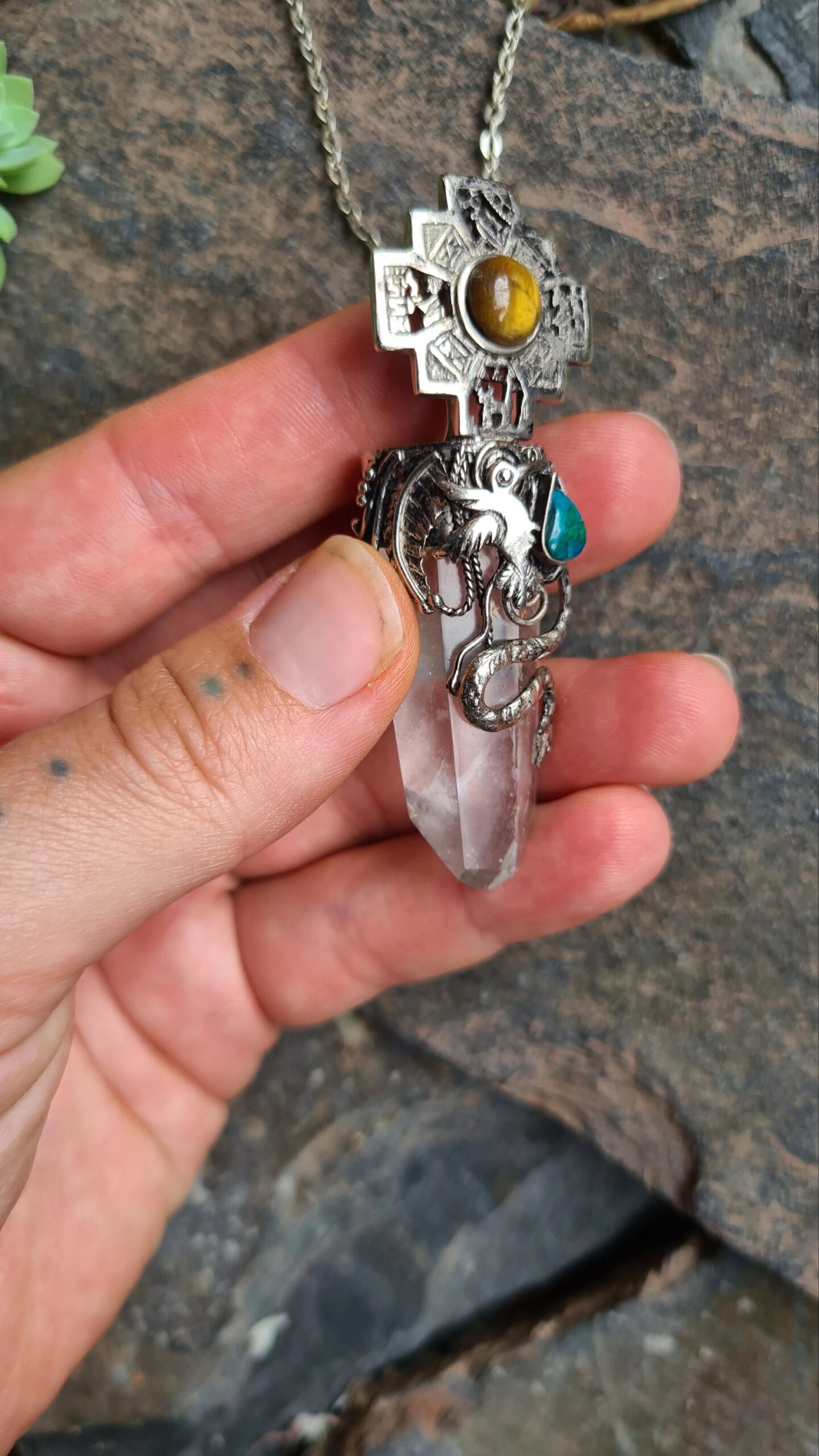 Cascading from the cross is a natural Quartz point, clear and radiant, wrapped in an intricate Alpaca silver design of the Kolibri (Hummingbird) and the Serpent. These guardians represent the eternal dance between heaven and earth, accented by a drop of turquoise-hued Chrysocolla.