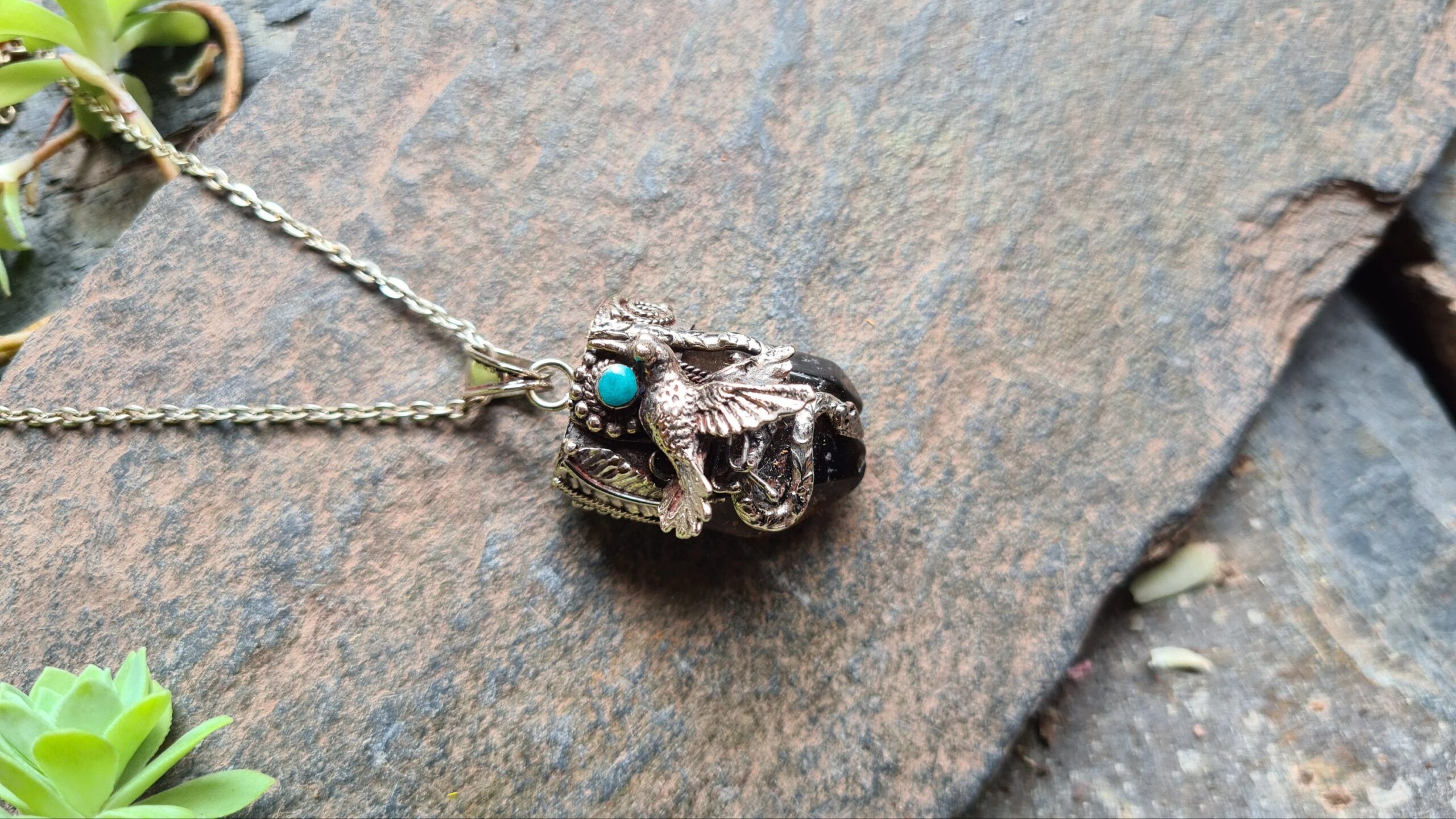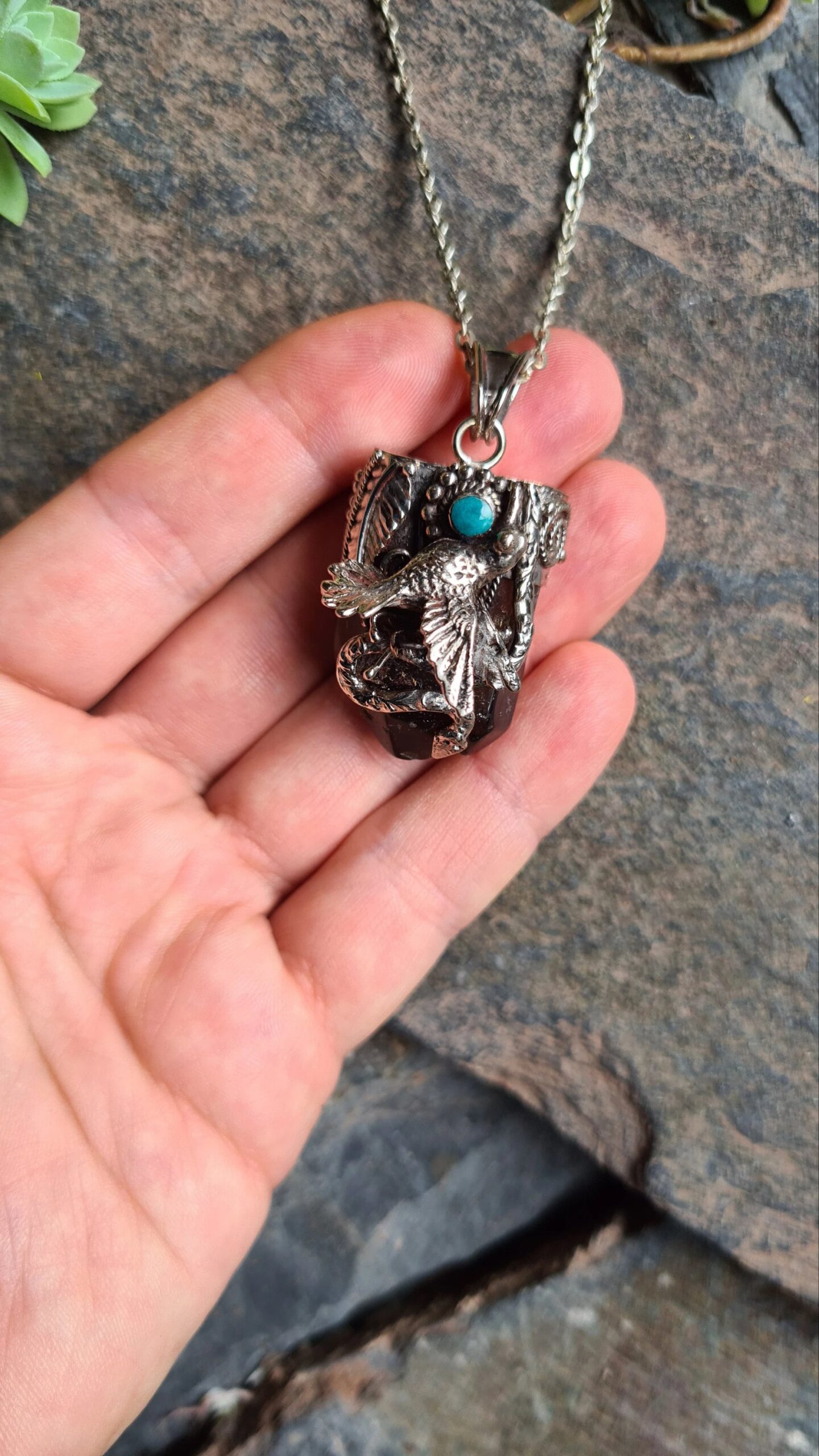 A powerful combination of grounding energy and soaring spirit. This handcrafted pendant features a natural Smoky Quartz point—a stone revered for its ability to absorb negativity and provide emotional balance.
