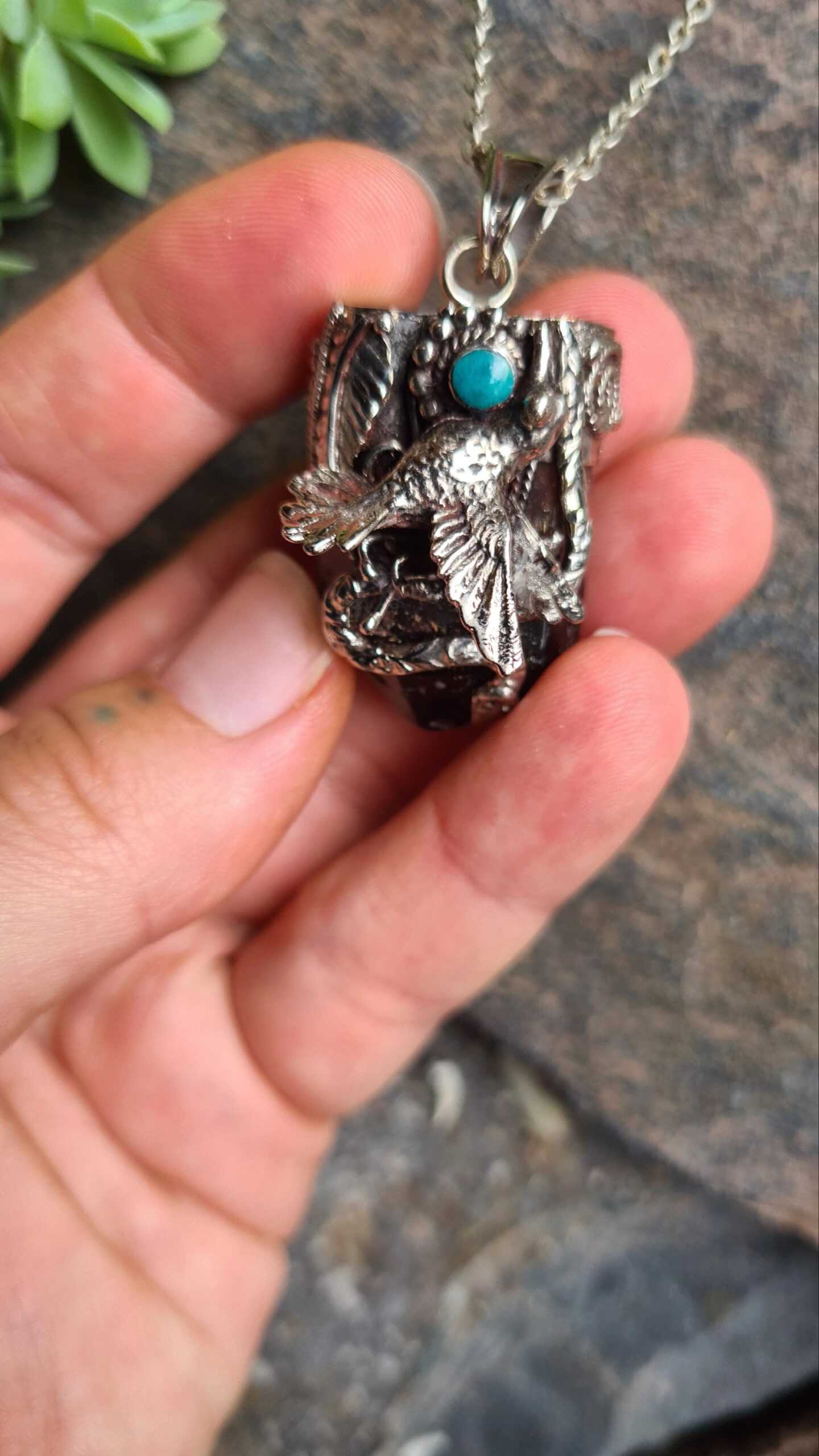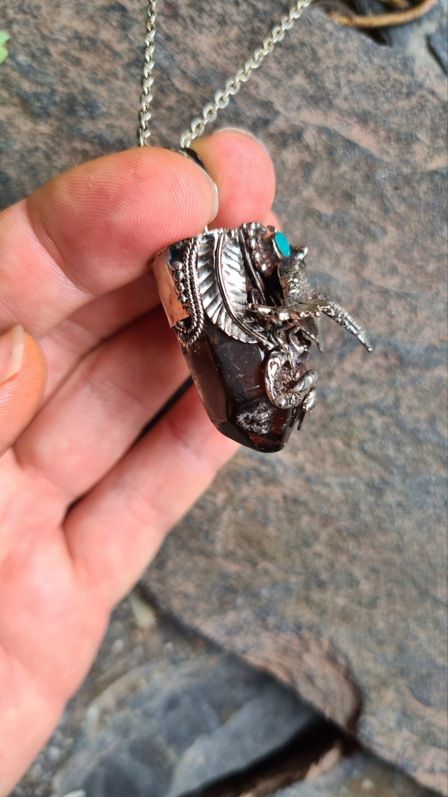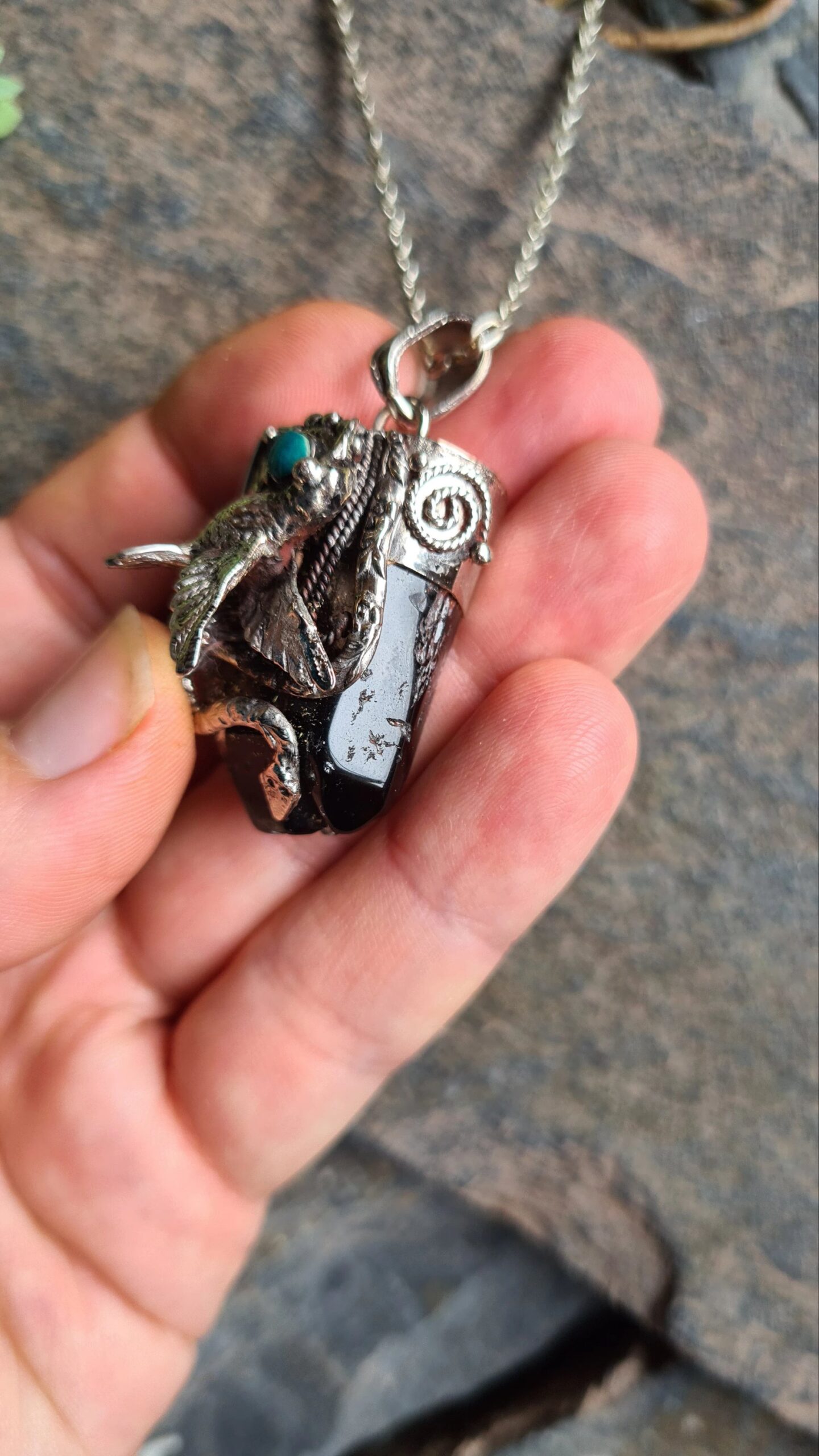 Crowning the crystal is an intricate Alpaca silver design of the Kolibri (Hummingbird) and the Serpent. These sacred Andean guardians represent the duality of life: the joy of the heavens and the wisdom of the earth. A vibrant Chrysocolla cabochon is inset at the center, adding a touch of Andean turquoise to this mystical piece.