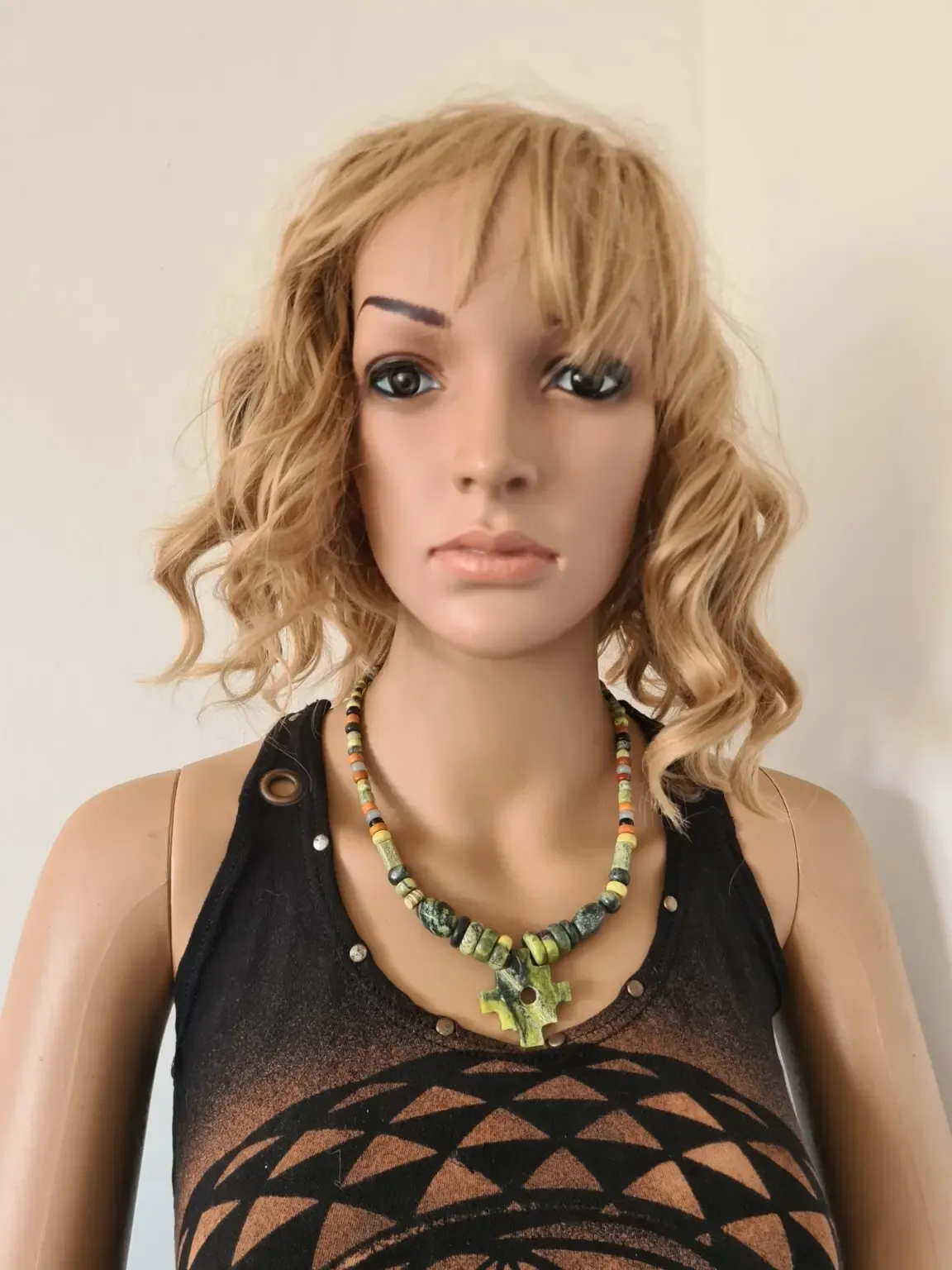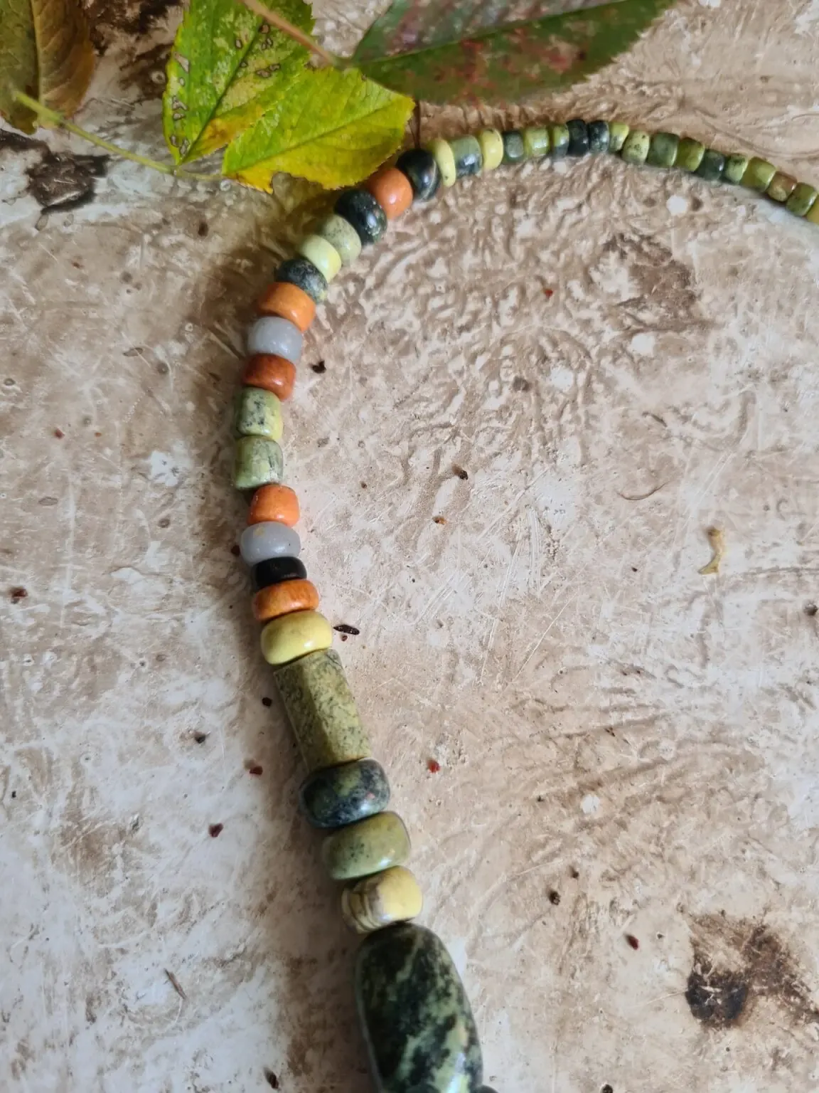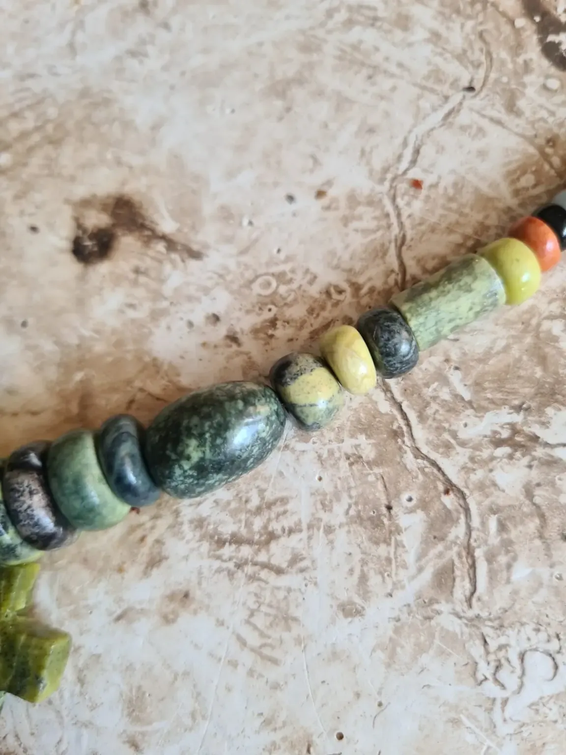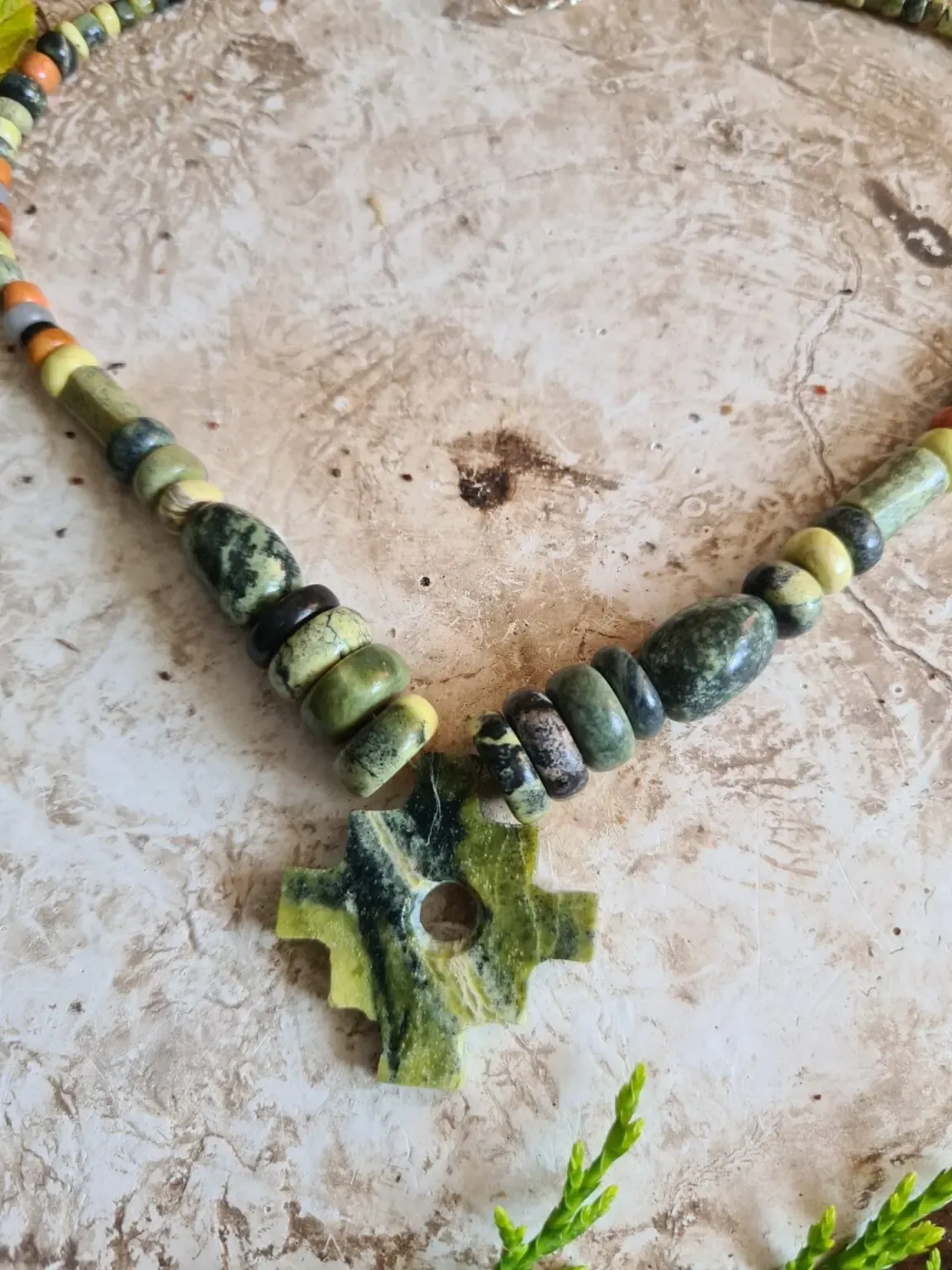 Beautiful light green Serpentine stone necklace with chunky beads, quartz and Jasper beads with a Serpentine stone chakana symbol.