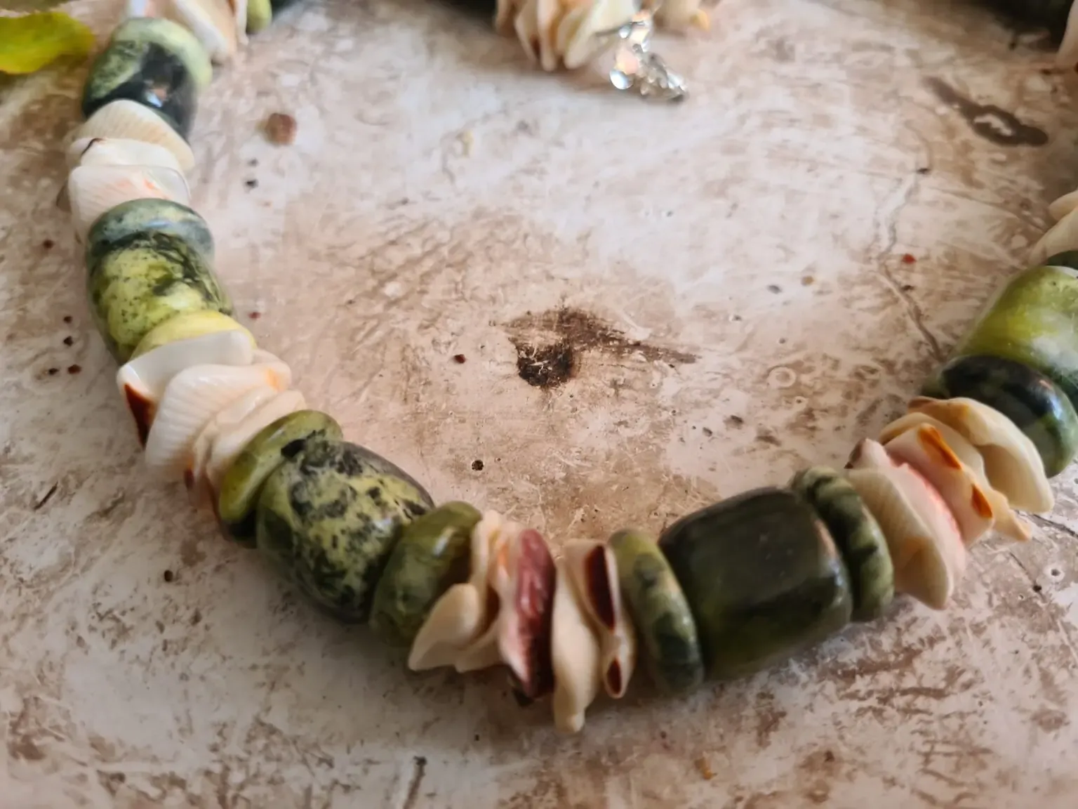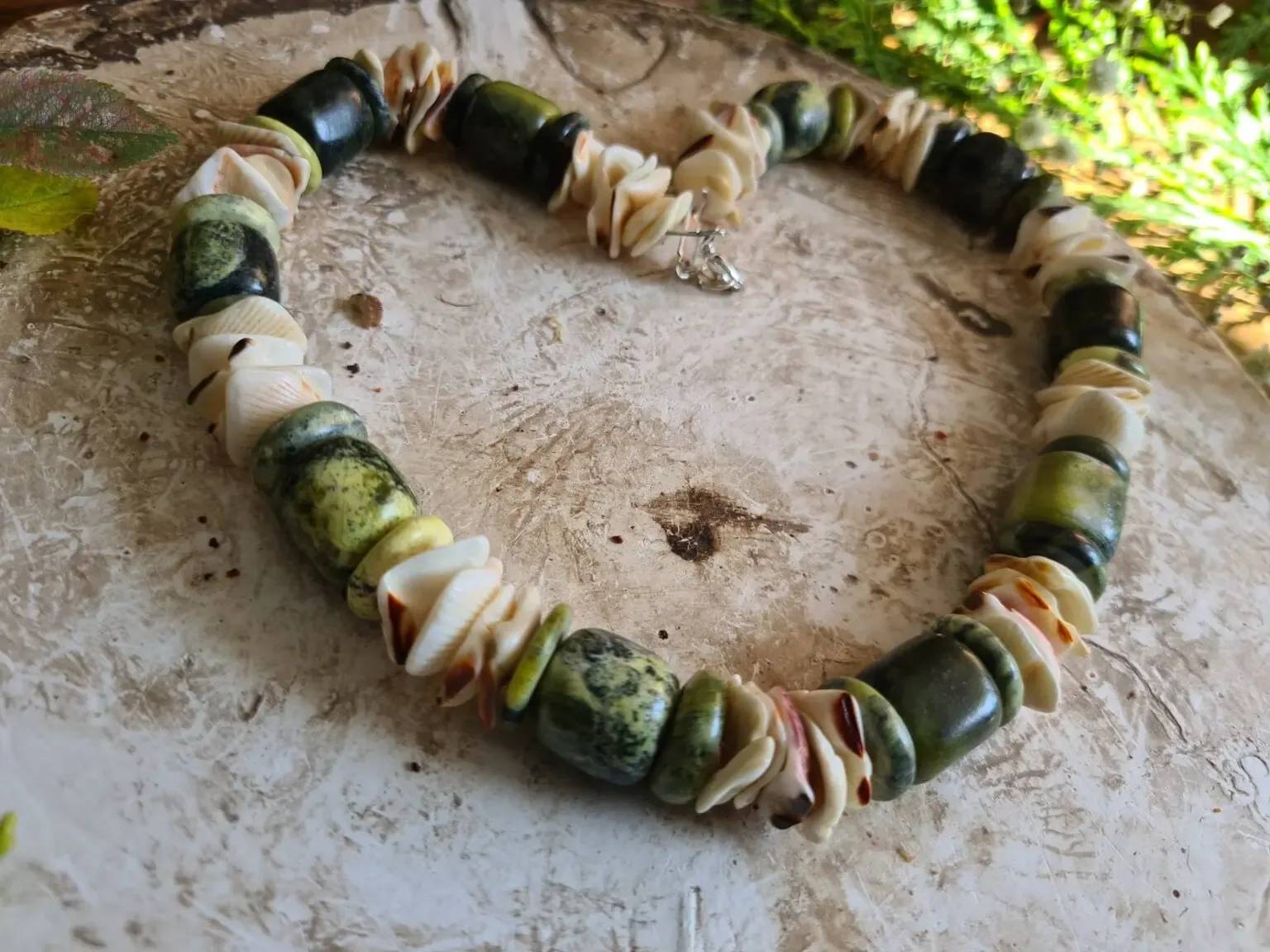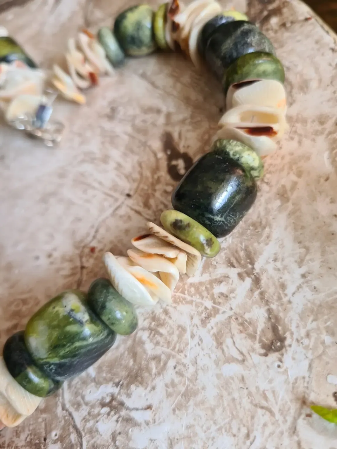 Beautiful light green Serpentine stone necklace with chunky beads and smooth shell slices.