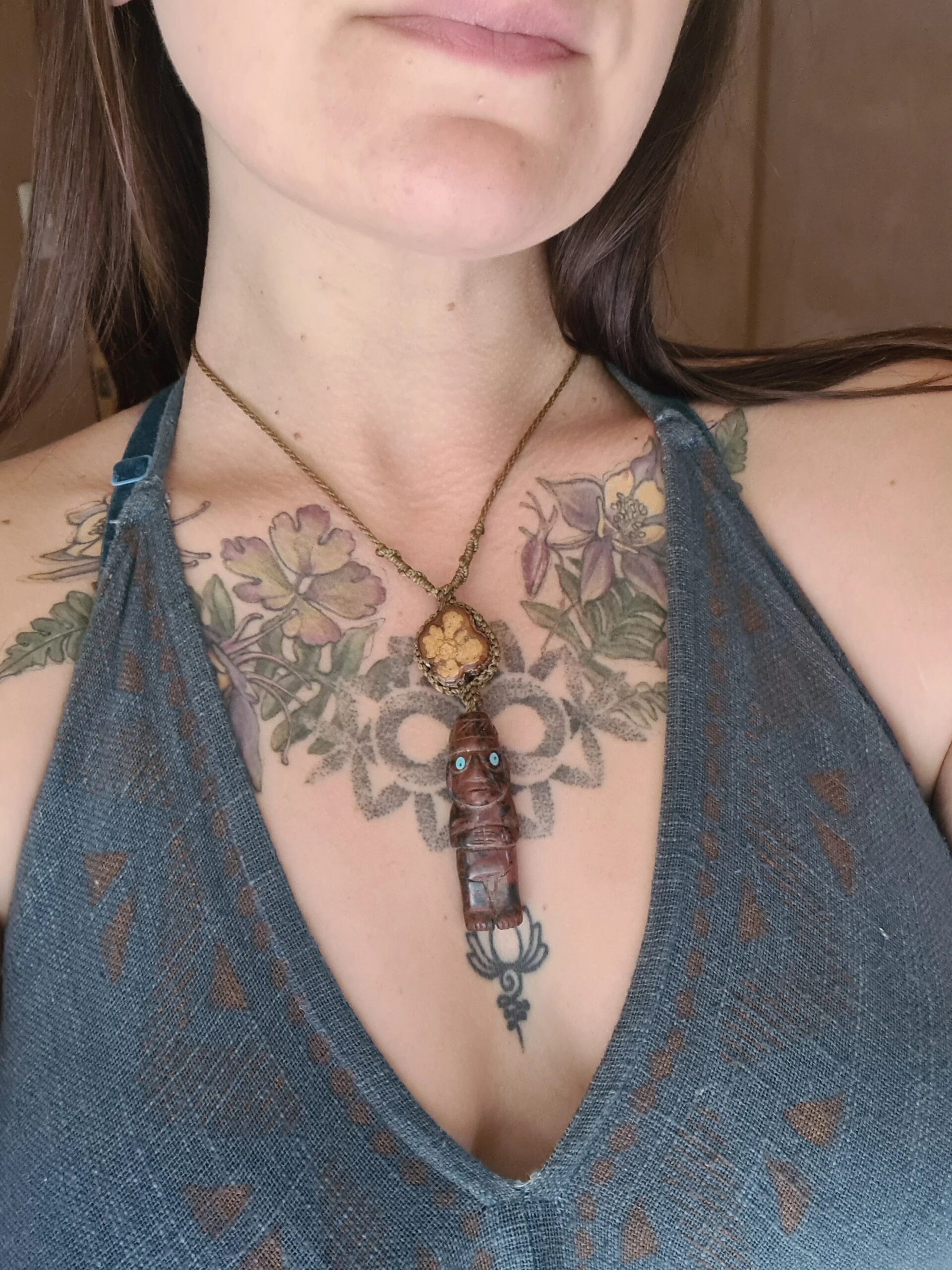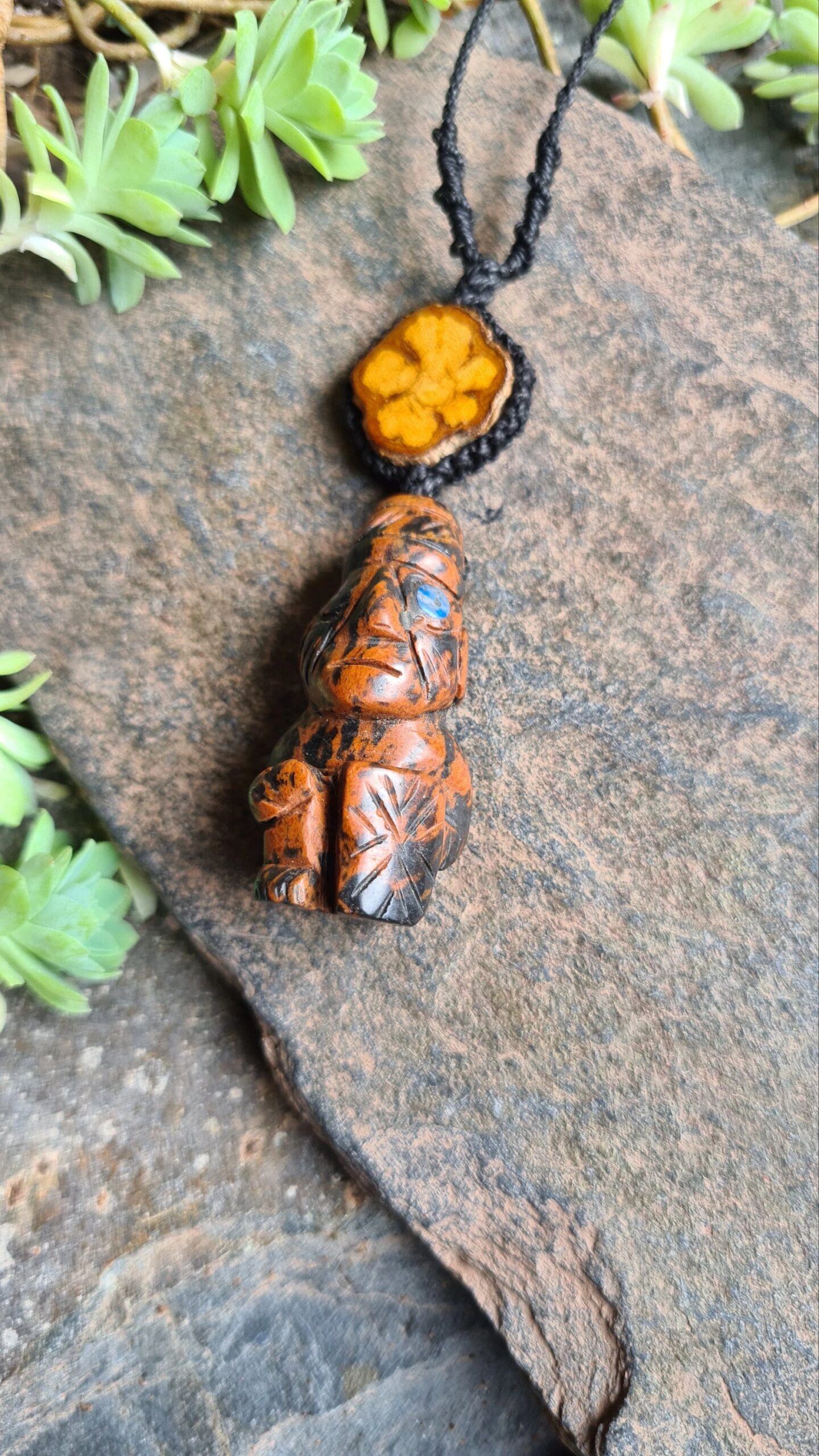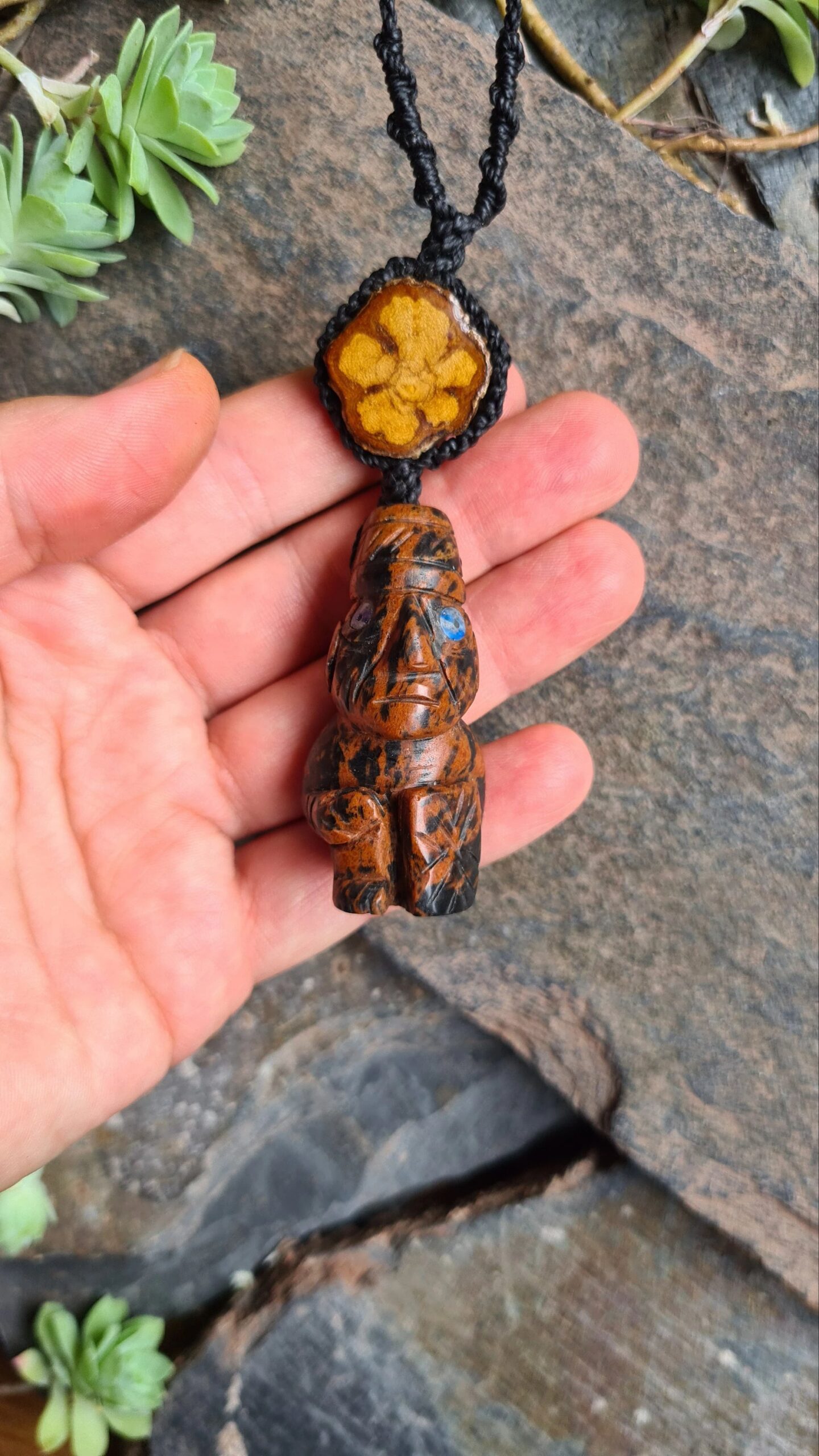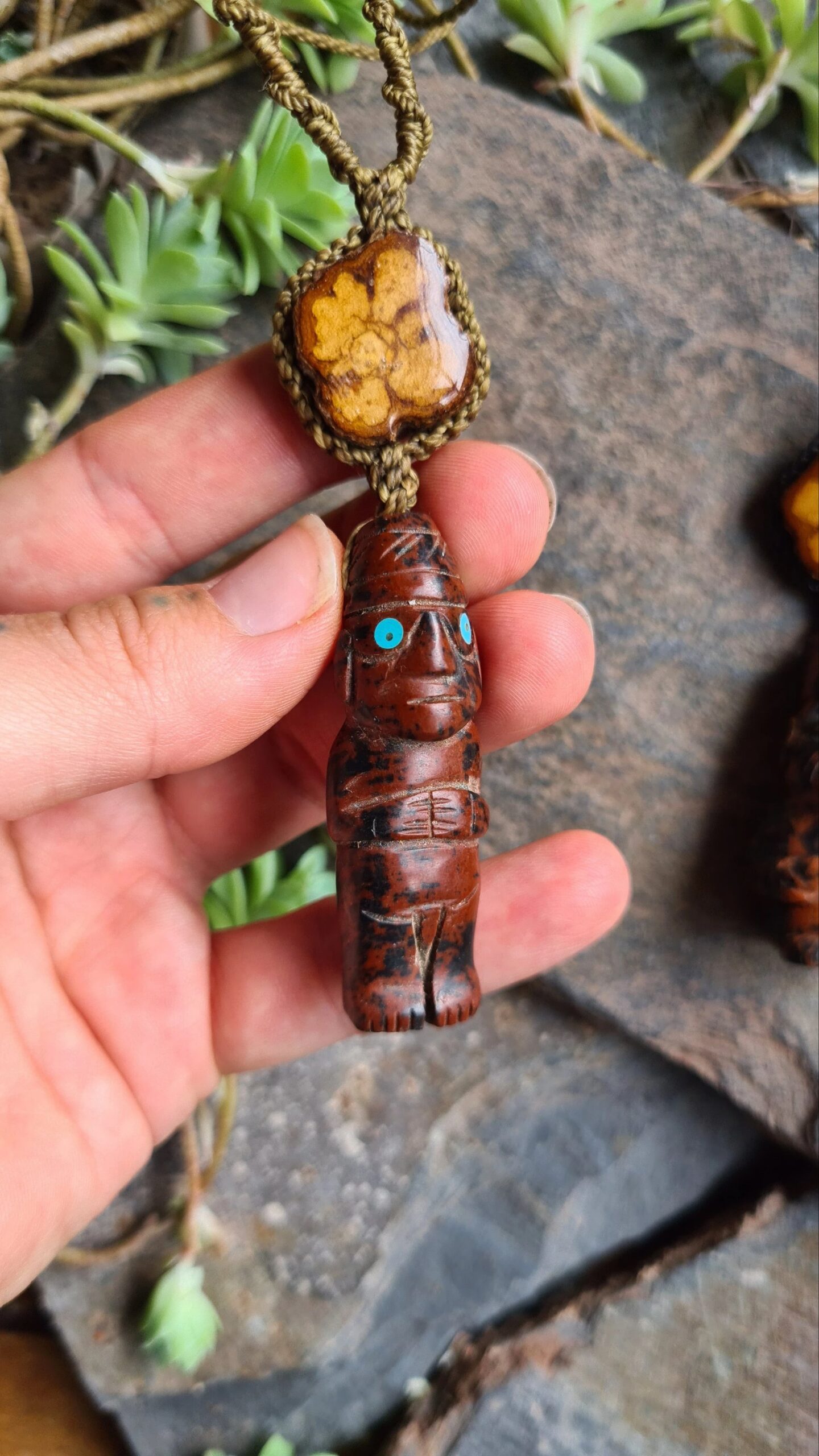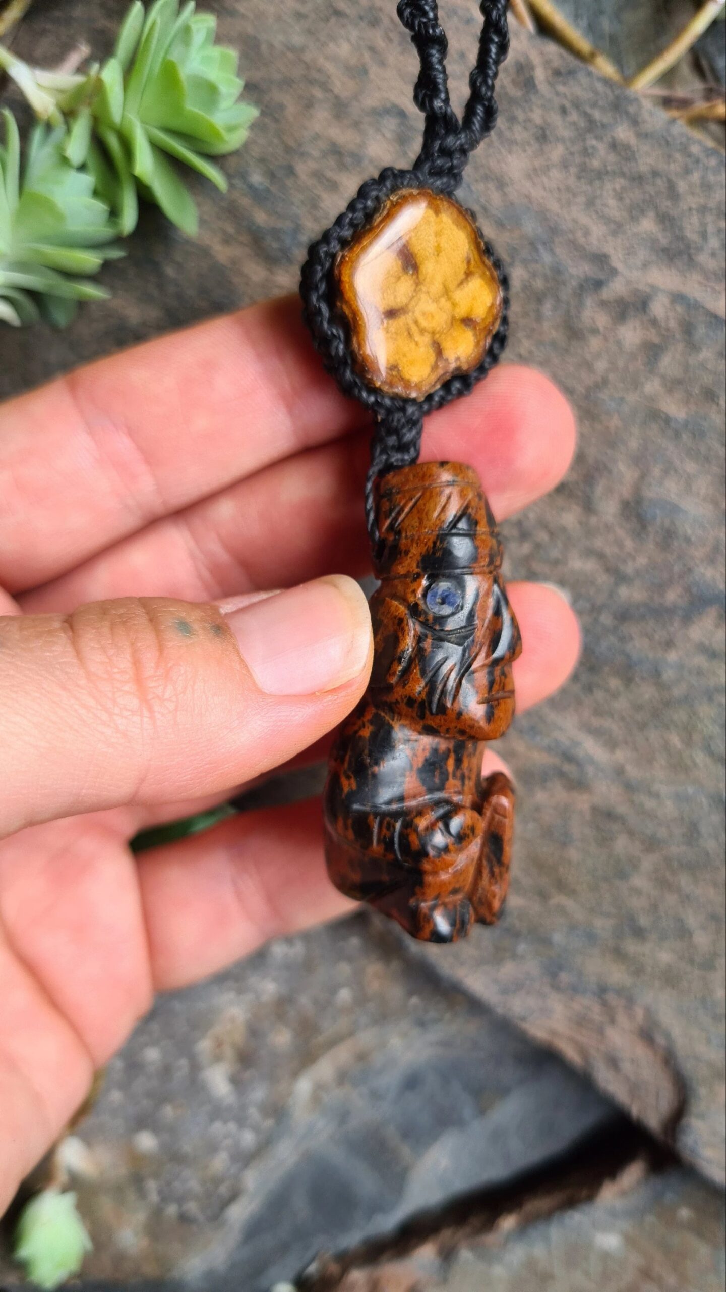 Embrace the protective power of the volcanic earth and the visionary wisdom of the jungle. These striking pendants feature hand-carved ancestral spirit figures made from Obsidian Mahogany—a natural volcanic glass known for its ability to ground the wearer and provide a shield against negativity.