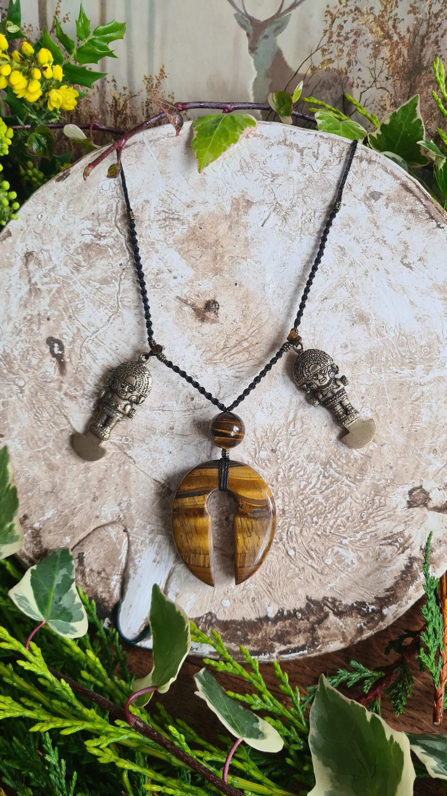 We created this piece using beautiful carved beads and large keyhole shape piece in Tiger eye stone. Each side is decorated with an Inca Tumi.