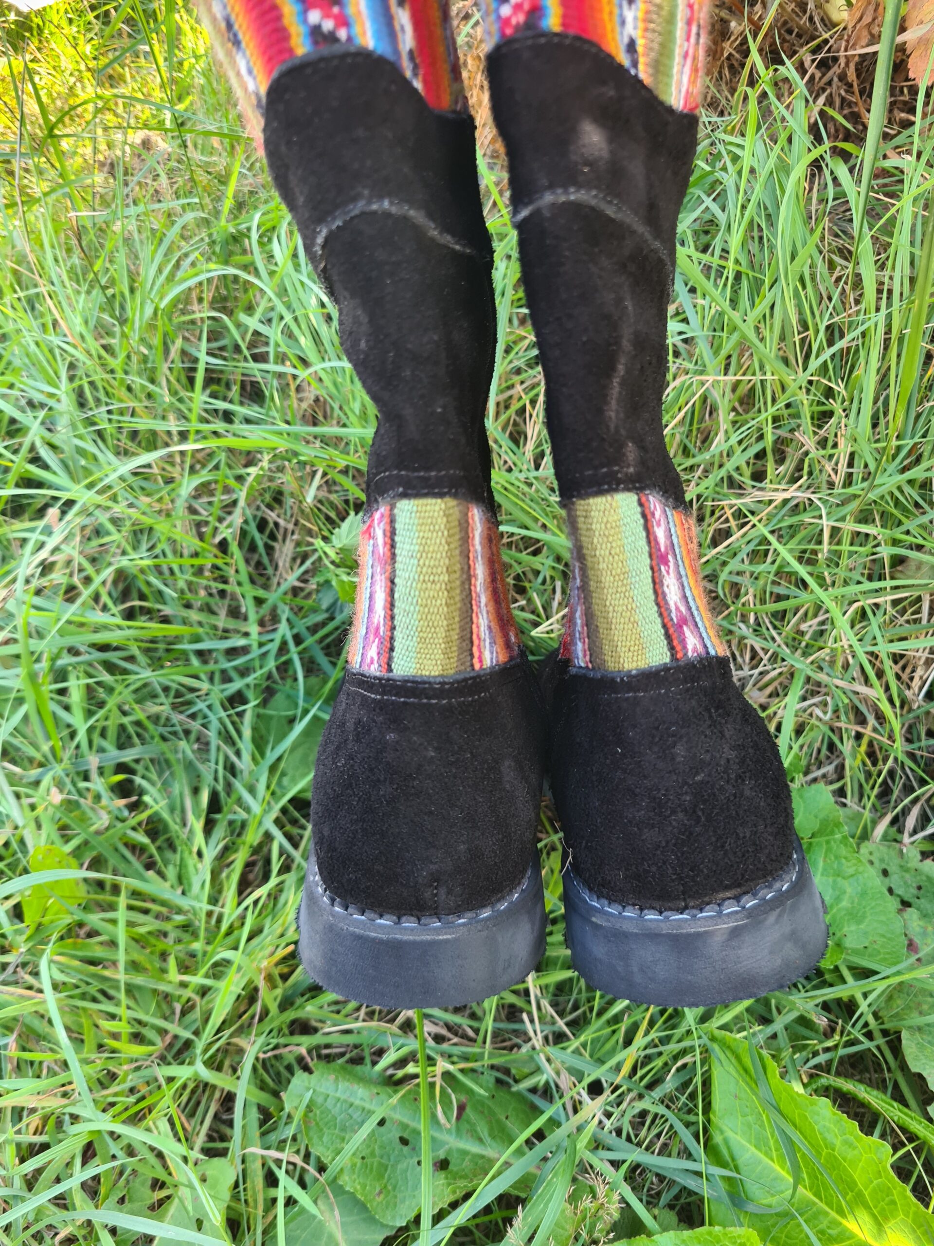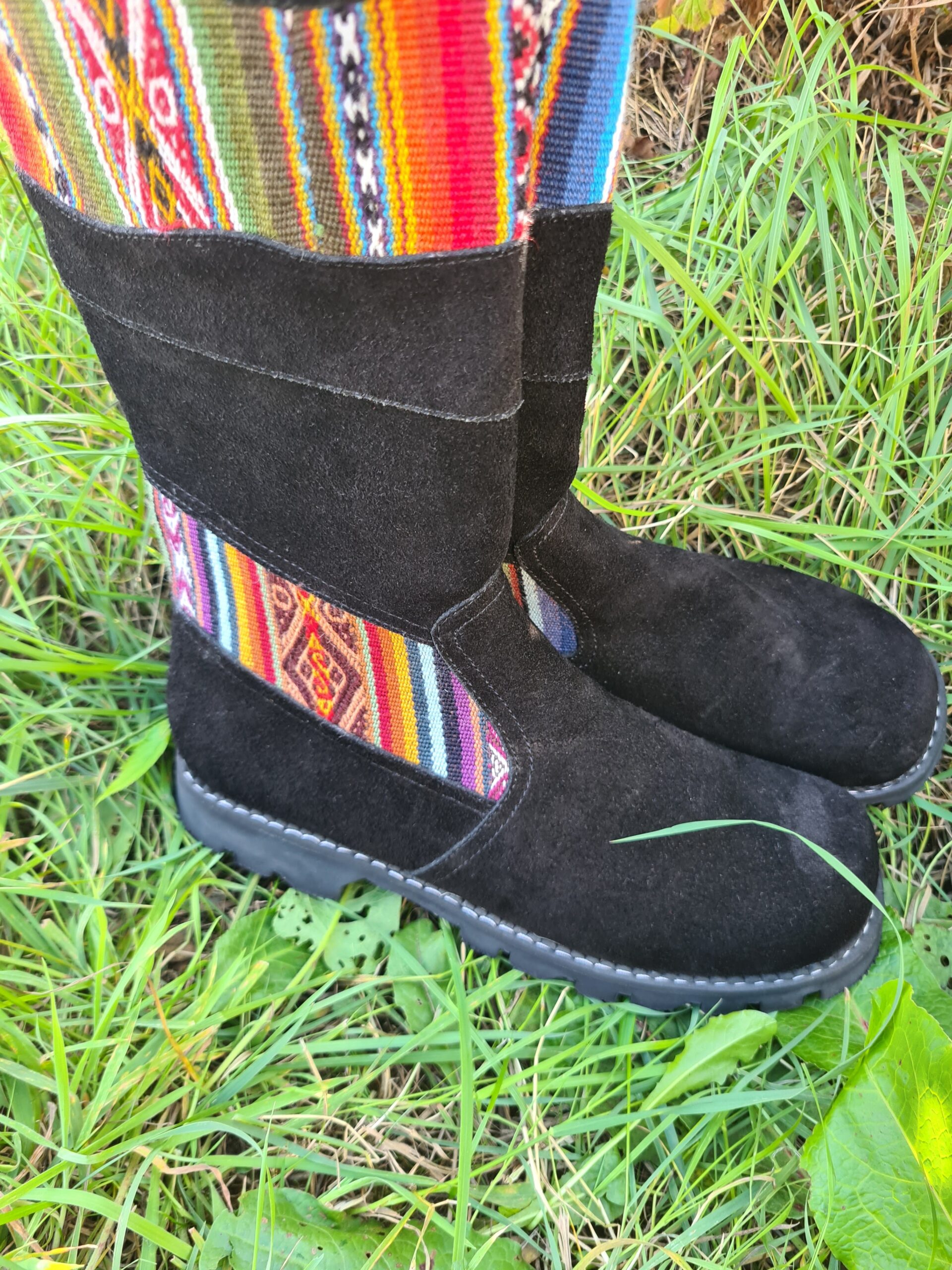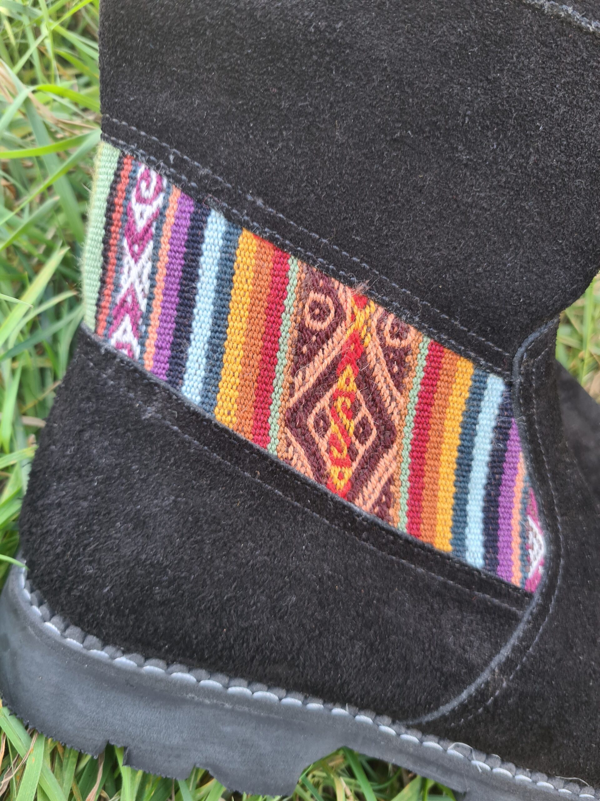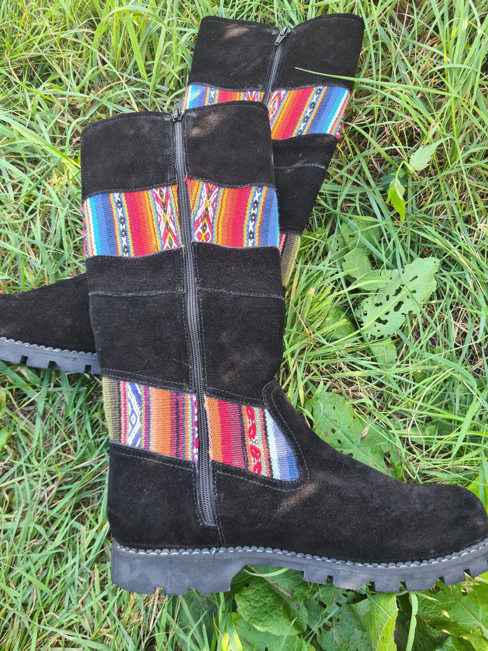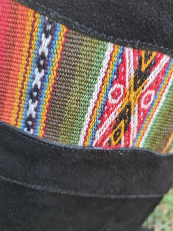 This pair of beautiful boots has been hand made in Peru. Created using black suede leather and traditional Peruvian wool fabric as decoration. Fully lined inside. There is a zip on the inside of the boot.